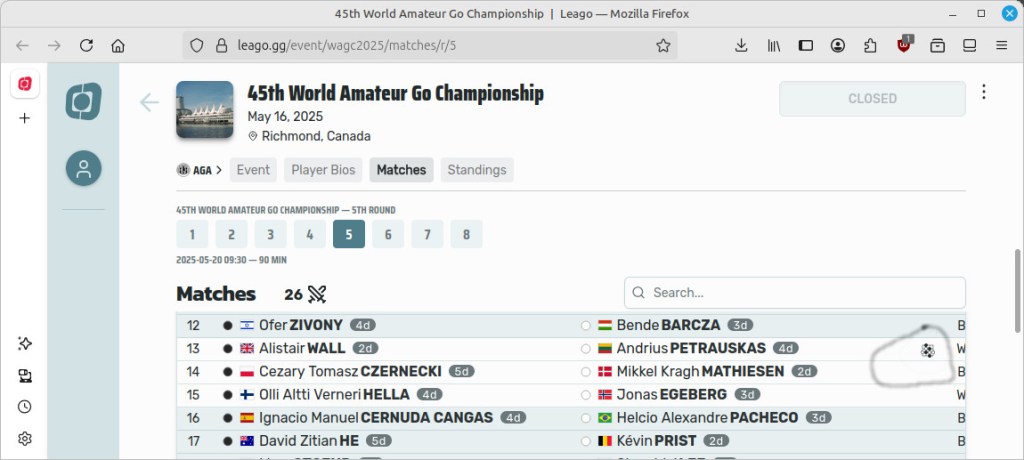 Update: On the WAGC site, matches tab, the marked symbol means the game was recorded, and clicking the symbol leads to the .sgf file.